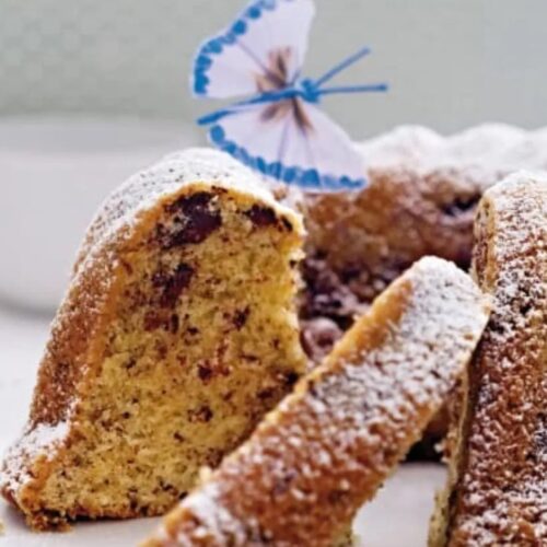Strijk het beslag glad in de vorm. Bak de cake 55-60 minuten in de oven. Controleer of hij gaar is door met een lange spies in het deeg te prikken. Blijft er beslag aan de spies kleven wanneer je de spies uit de cake haalt, bak hem dan nog 5-10 minuten tot hij gaar is. Neem uit de oven en laat de cake ca. 30 minuten in de vorm afkoelen. Stort uit de vorm en laat afkoelen. Bestrooi met poedersuiker.